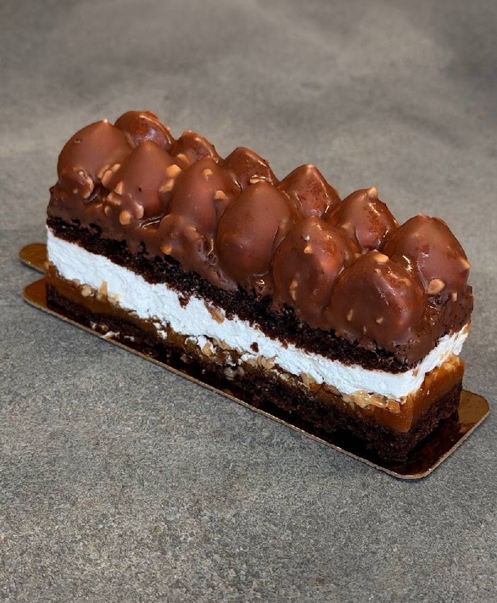 Сочный шоколадный бисквит, слой домашней соленой карамели, жареный арахис, арахисовая нуга-суфле и шоколадный мусс. Покрыто молочным шоколадом с арахисом.