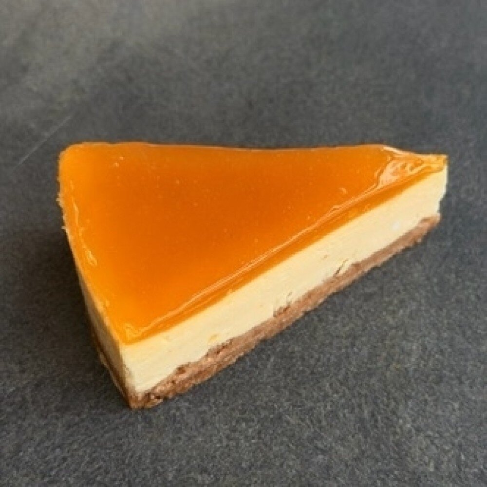 Песочная основа с творожно-сливочным запеченным кремом. Сверху конфи из пюре манго и маракуйи.