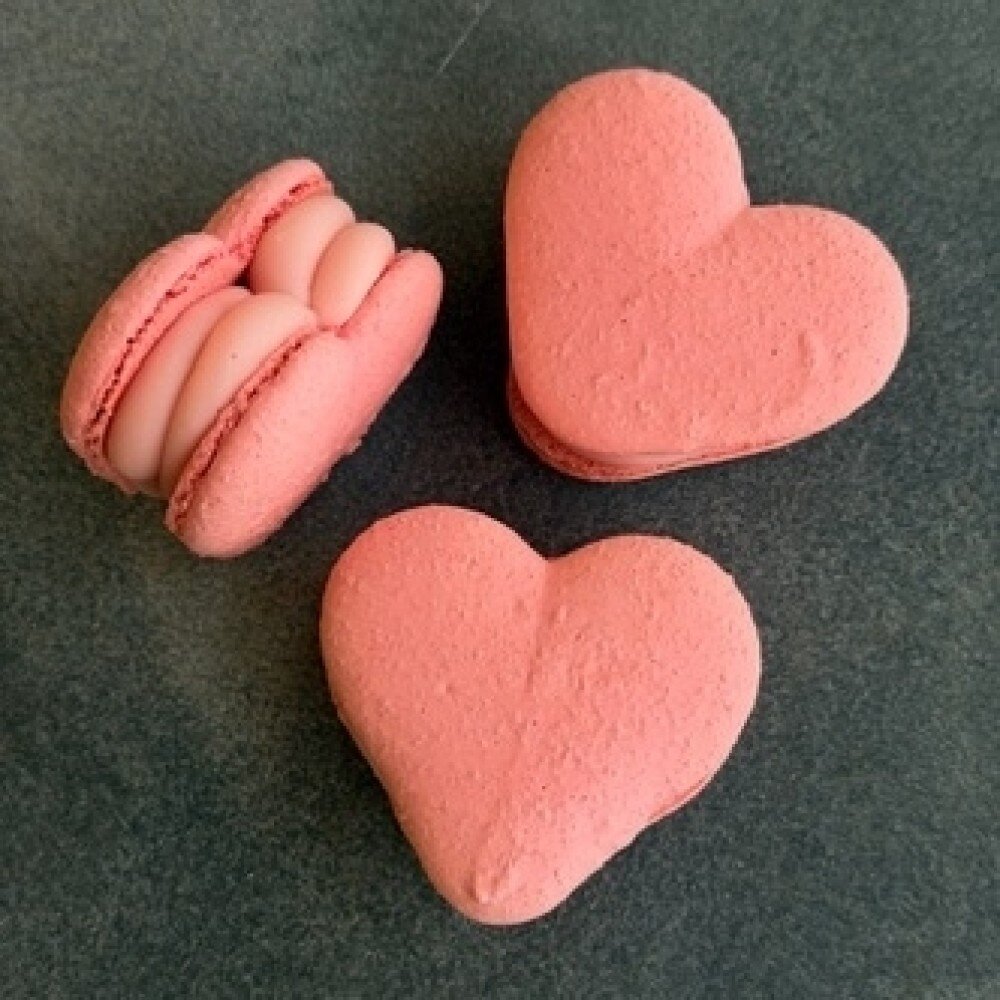 Крышечки на основе миндальной муки с ганашом на белом бельгийском шоколаде со вкусом жвачки бабл-гам с клубничным центром внутри в форме сердца.