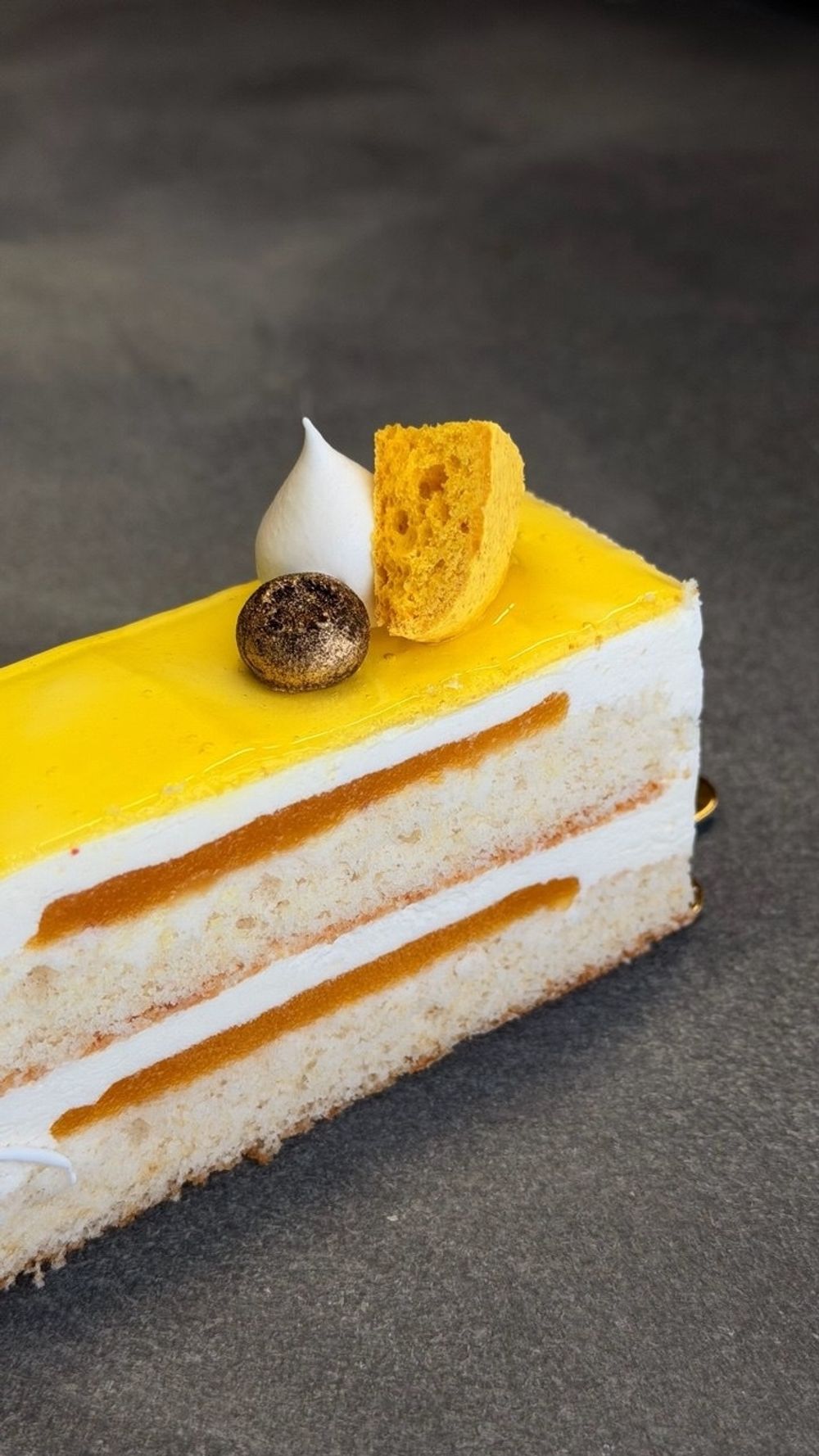 Сочный ванильный бисквит, сливочный мусс и начинка манго/маракуйя в формате нарезного пирожного.