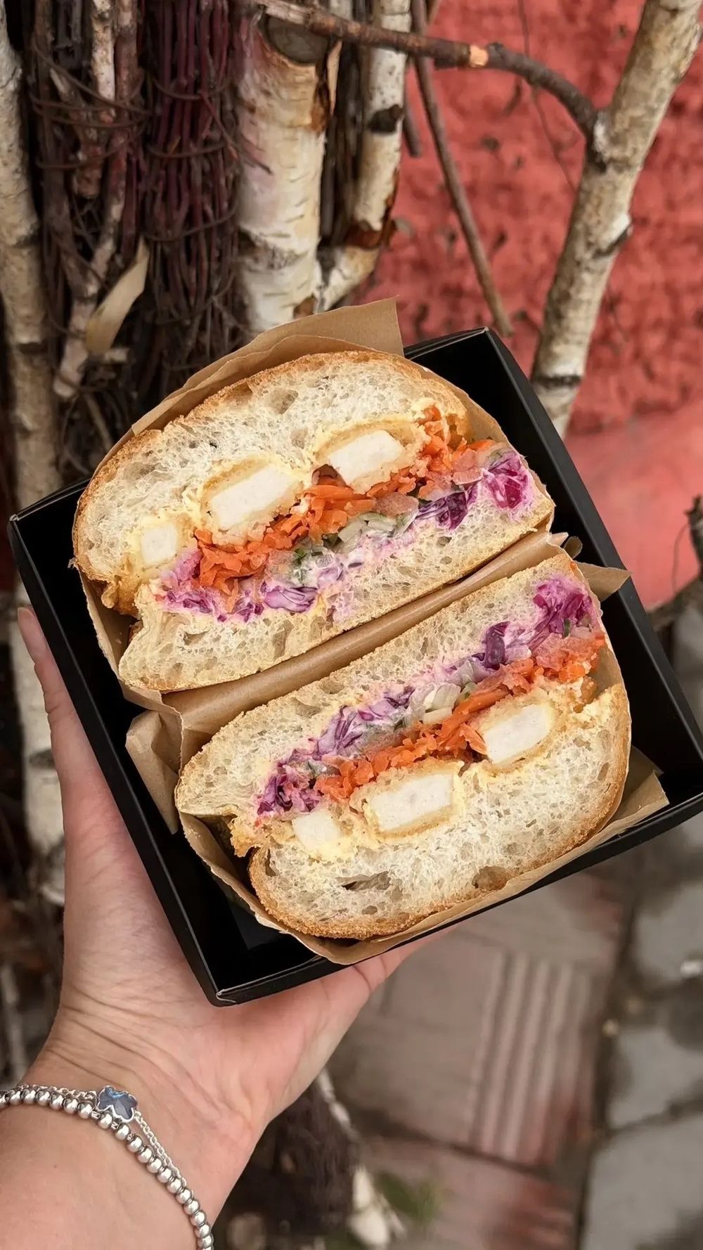 Свежайшая чиабатта собственного производства с куриным наггетсом, красной капустой, корейской морковью и свежими овощами.
