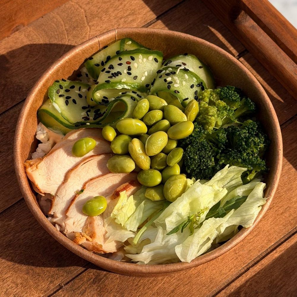 Летний боул в составе которого, свежий огурчик, брокколи, айсберг, бобы эдамаме, курочка сувид и рис. Заправлено ореховым соусом.