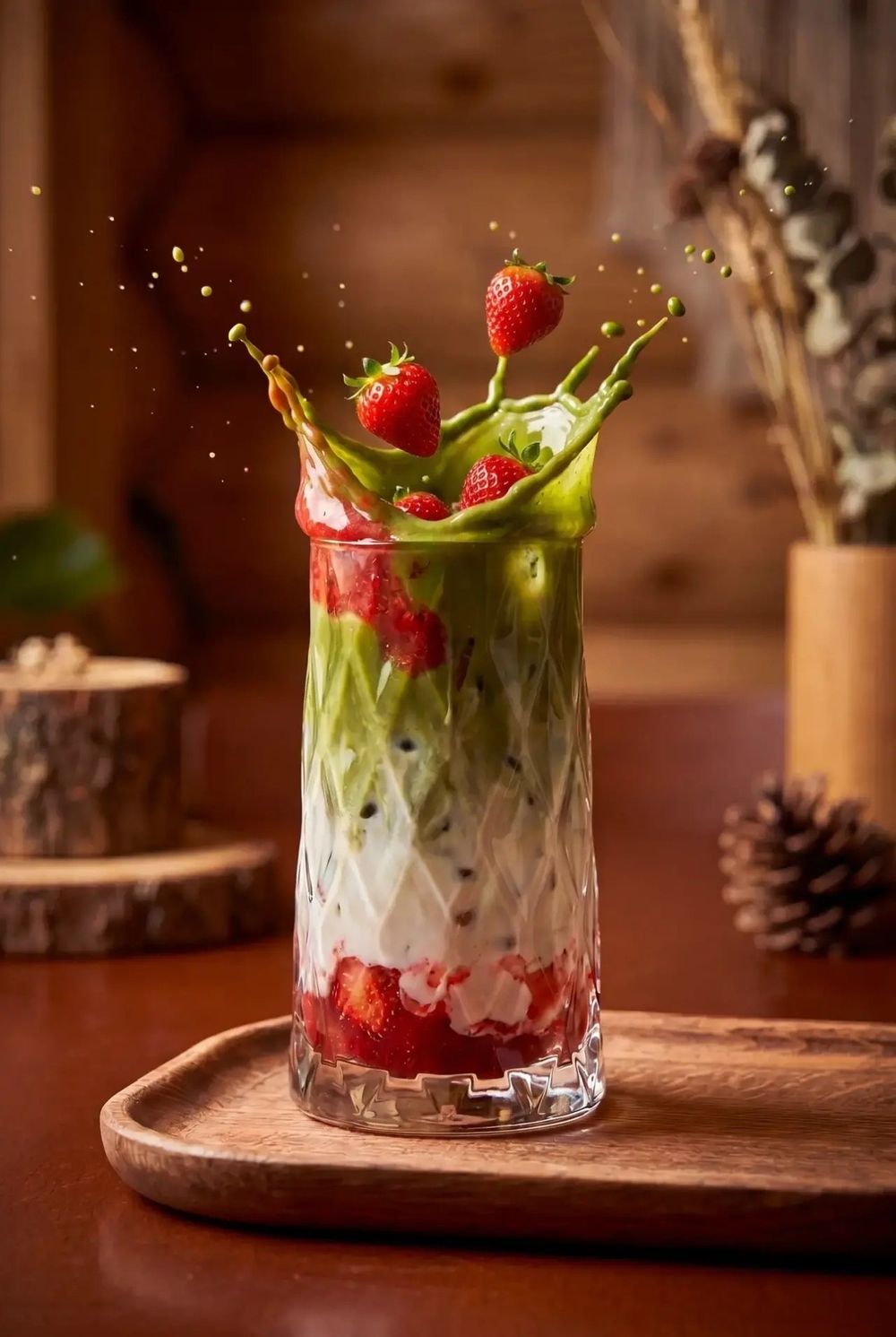 Кремовая зелёная матча с лёгкой сладостью сочной клубники.